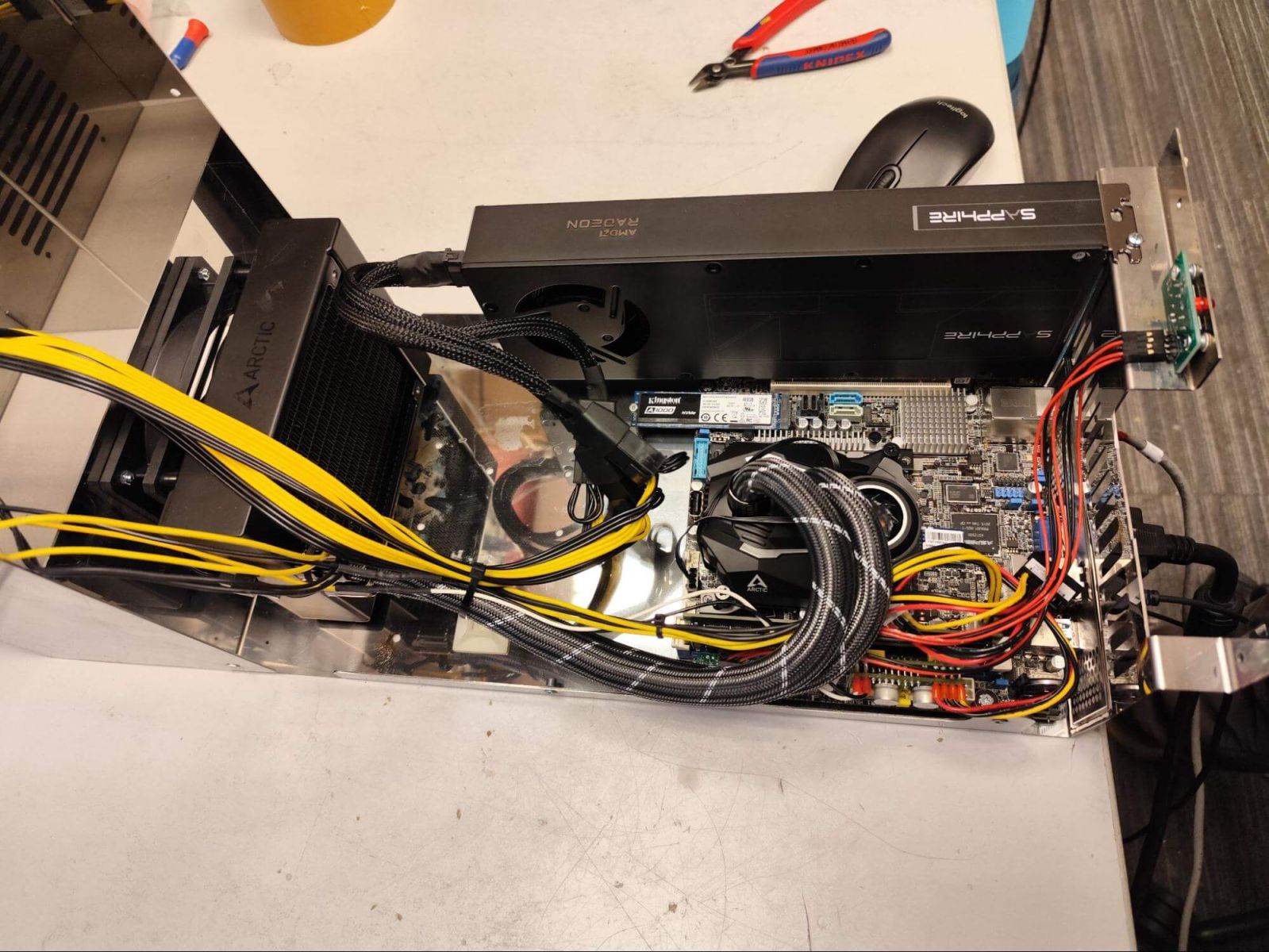 Thật tiếc là chúng tôi không chụp được ảnh của cấu hình đầu tiên (sử dụng bộ xử lý EPYC); tuy nhiên, chúng tôi sẽ cho các bạn xem cấu hình thứ hai. Cả hai máy chủ đều được lắp ráp trong khung máy tùy chỉnh do chúng tôi phát triển, có thể xếp chồng ba tầng trên giá đỡ, chiếm 3U không gian. Chúng tôi sẽ cung cấp thêm chi tiết về các khung máy này trong các bài viết sắp tới.