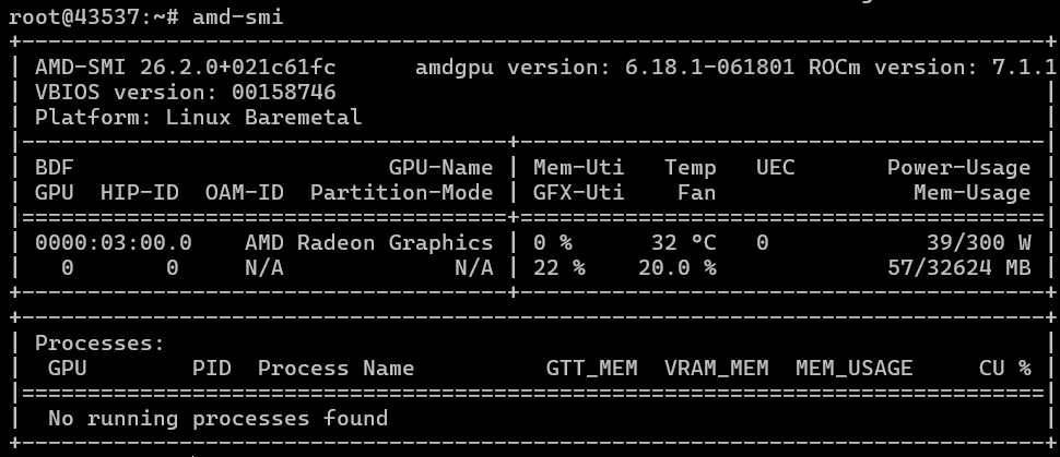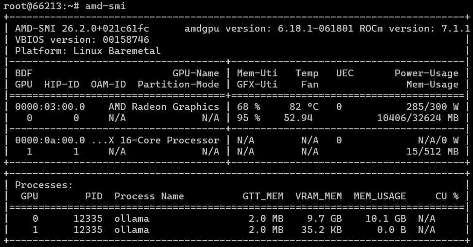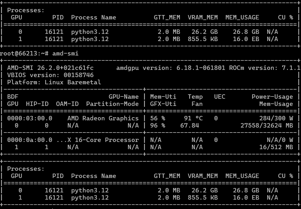 Nếu mọi thứ diễn ra suôn sẻ với bạn (giống như với chúng tôi), thì lệnh amd-smi (nó có gợi nhớ đến điều gì không?…) sẽ cung cấp cho bạn kết quả tương tự. Ảnh chụp màn hình đầu tiên hiển thị hiệu năng trên bộ xử lý EPYC (được thể hiện bằng sự hiện diện của thành phần liên quan đến AMD thứ hai trong ảnh chụp màn hình), và ảnh chụp màn hình thứ hai hiển thị hiệu năng trên bộ xử lý i9. Trong cả hai trường hợp, chúng tôi đều sử dụng ROCm phiên bản 7.1.1.