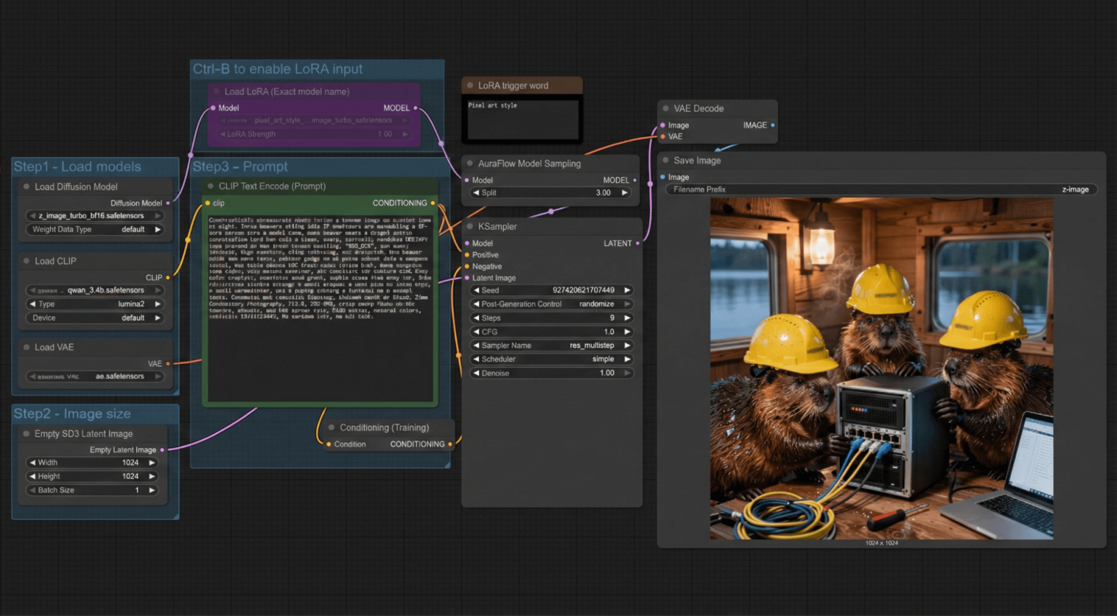 Theo truyền thống thử nghiệm của chúng tôi , chúng tôi sẽ thử hiển thị đồ họa và video trong ComfyUI. Sử dụng mô hình Z-image Turbo, với độ phân giải 1024x1024… và một thử nghiệm nhanh với chủ đề “gấu”.