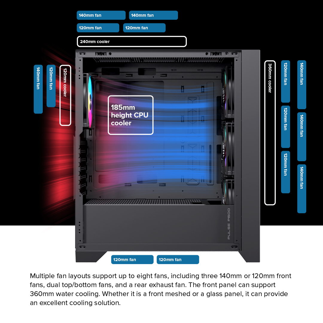 • - Chiều cao Tản nhiệt CPU tối đa: 185mm