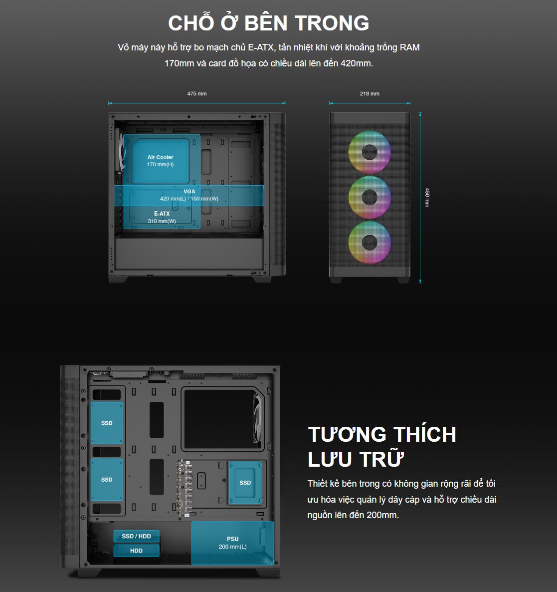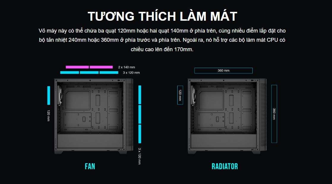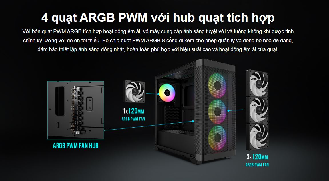 • - Fan đi kèm: Front: 3x 120mm ARGB fan, Rear: 1x 120mm ARGB fan