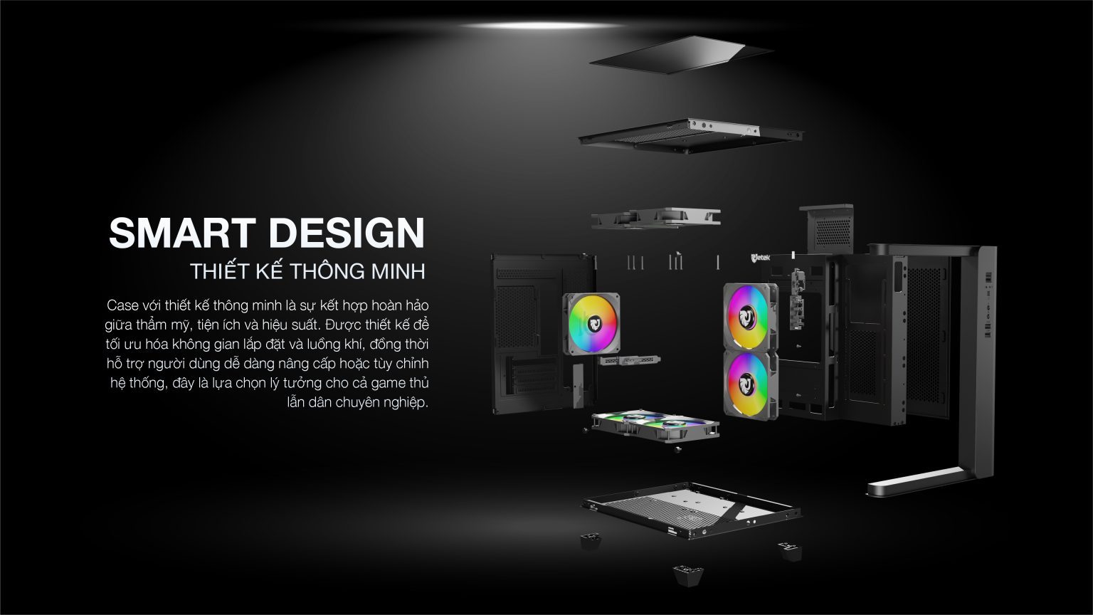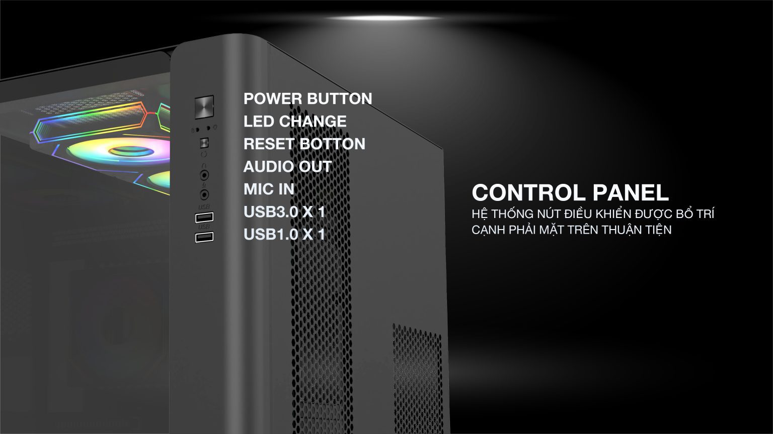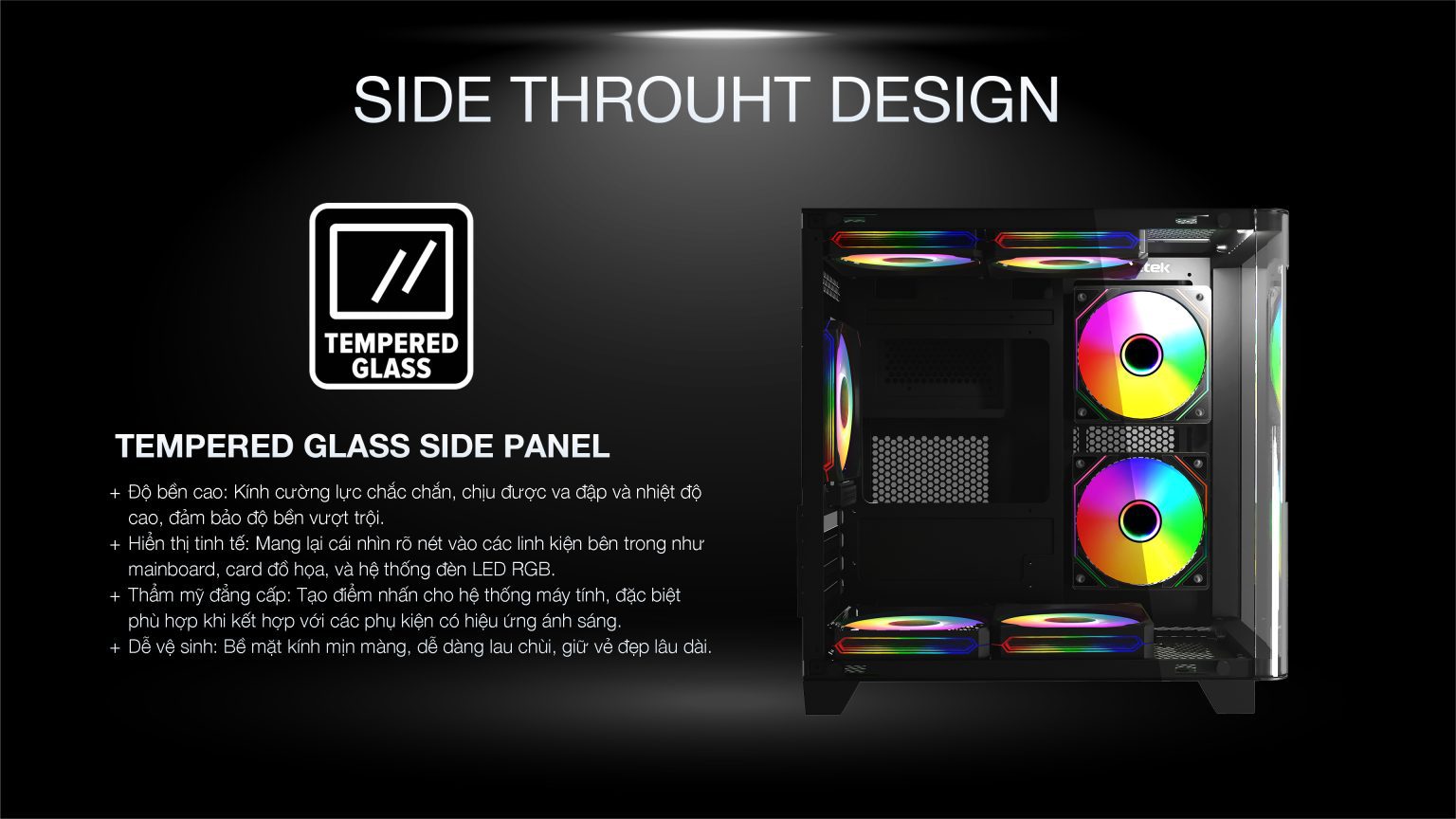 • - Mặt kính cường lực (Tempered Glass): Hiển thị toàn bộ hệ thống linh kiện bên trong với hiệu ứng ánh sáng RGB rực rỡ, giúp tôn lên vẻ đẹp và cá tính của bộ máy.