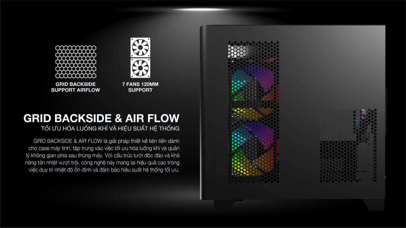 • - Luồng khí hoàn hảo: Thiết kế thông minh đảm bảo luồng khí lưu thông tối ưu, hỗ trợ lắp đặt nhiều quạt và hệ thống làm mát nước, giữ nhiệt độ luôn ổn định.