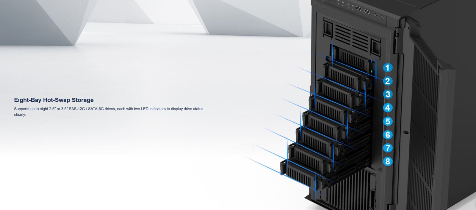 • - 8 khay ổ đĩa có thể tháo lắp nóng, chứa tối đa 8 ổ đĩa SAS-12G / SATA-6G 3,5” hoặc 2,5”, với hai đèn LED hiển thị trạng thái hoạt động của ổ đĩa.