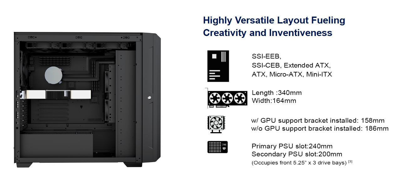 • Khe cắm PSU phụ: 200mm (Chiếm 3 khoang ổ đĩa 5,25” phía trước) [3]