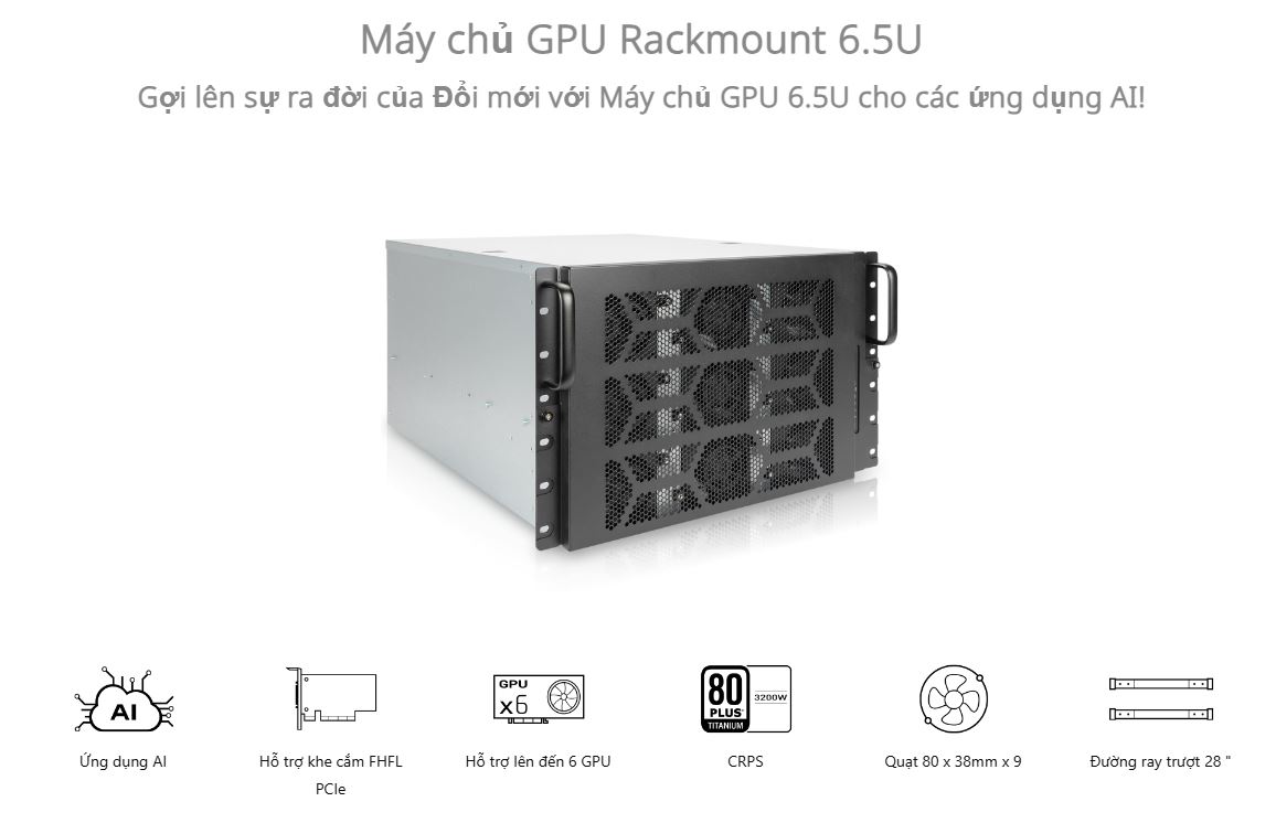 Máy chủ GPU IW-RG650B 6.5U được thiết kế đặc biệt cho các ứng dụng AI và HPC, có buồng GPU rộng rãi, độc lập hỗ trợ nhiều cài đặt GPU cao cấp, cho phép bạn xây dựng các mô hình AI hiệu quả với chi phí tính toán phần cứng hợp lý.