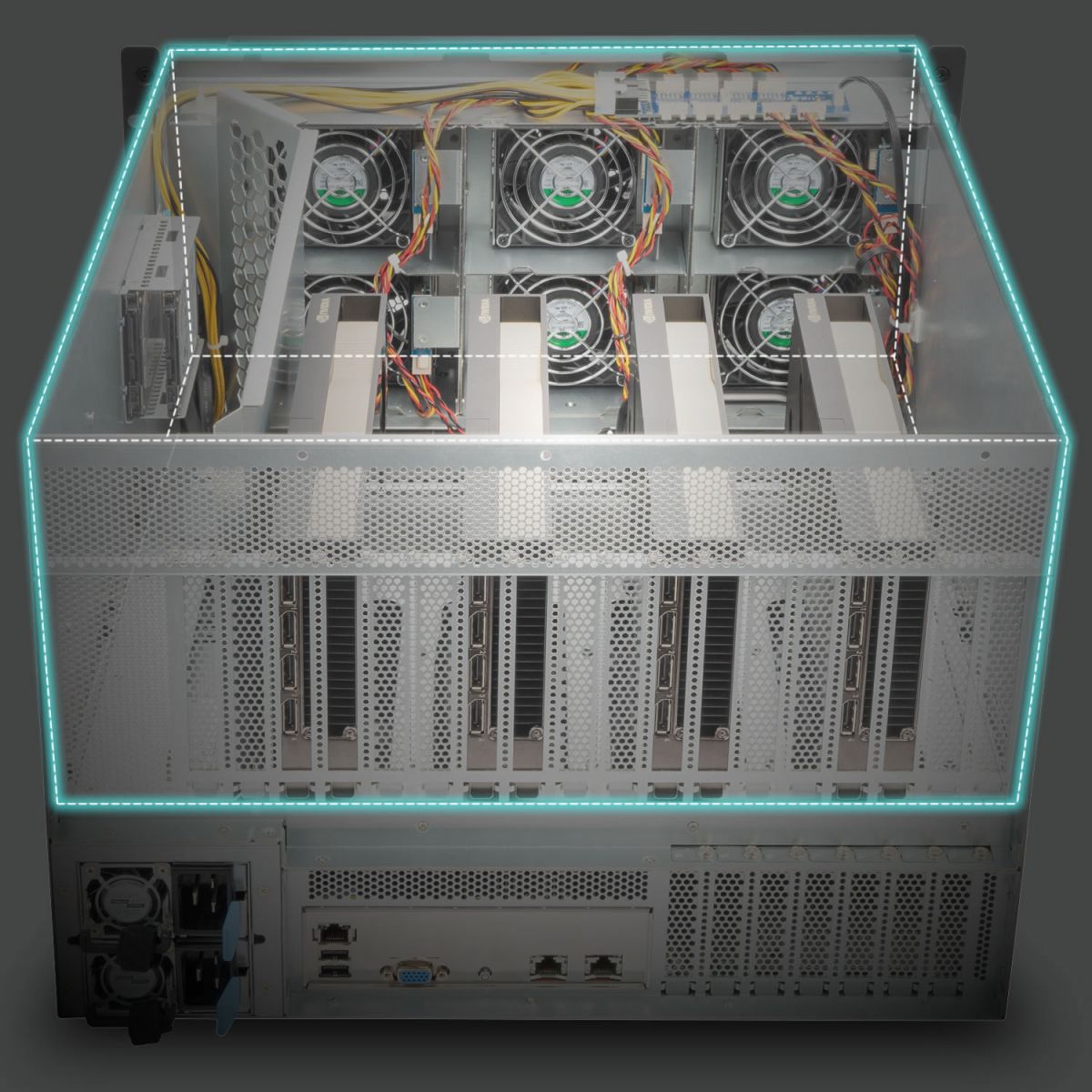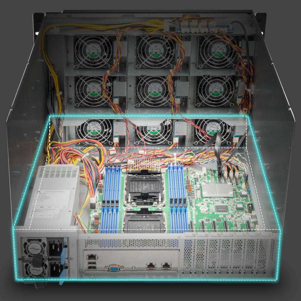 IW-RG650B có thiết kế buồng kép 6.5U, với buồng 4.5U cho GPU và buồng 2U cho các thành phần hệ thống, nâng cao khả năng mở rộng, hợp lý hóa quy trình lắp ráp và tạo điều kiện bảo trì trong tương lai.