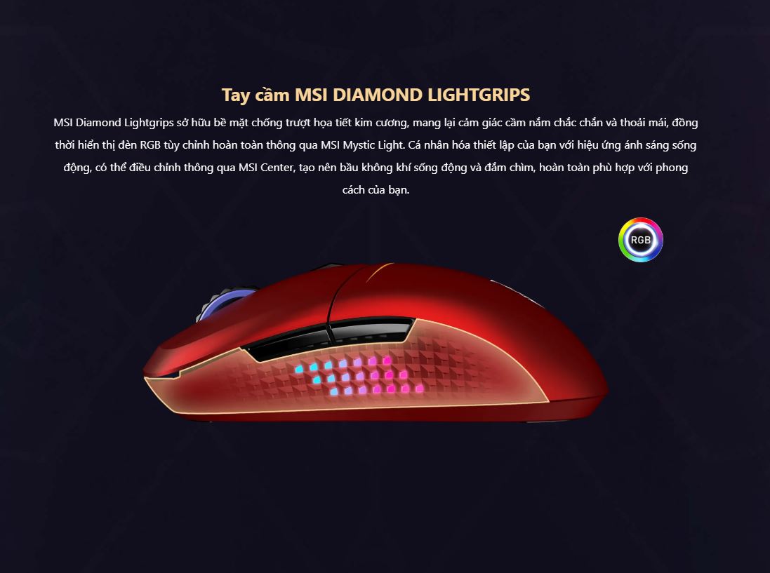 • - MSI DIAMOND LIGHTGRIPS - Với bề mặt chống trượt, MSI Diamond LightGrips cho phép game thủ cầm chuột chắc chắn trên tay để thực hiện các thao tác chính xác, cùng với đèn RGB có thể tùy chỉnh hoàn toàn.