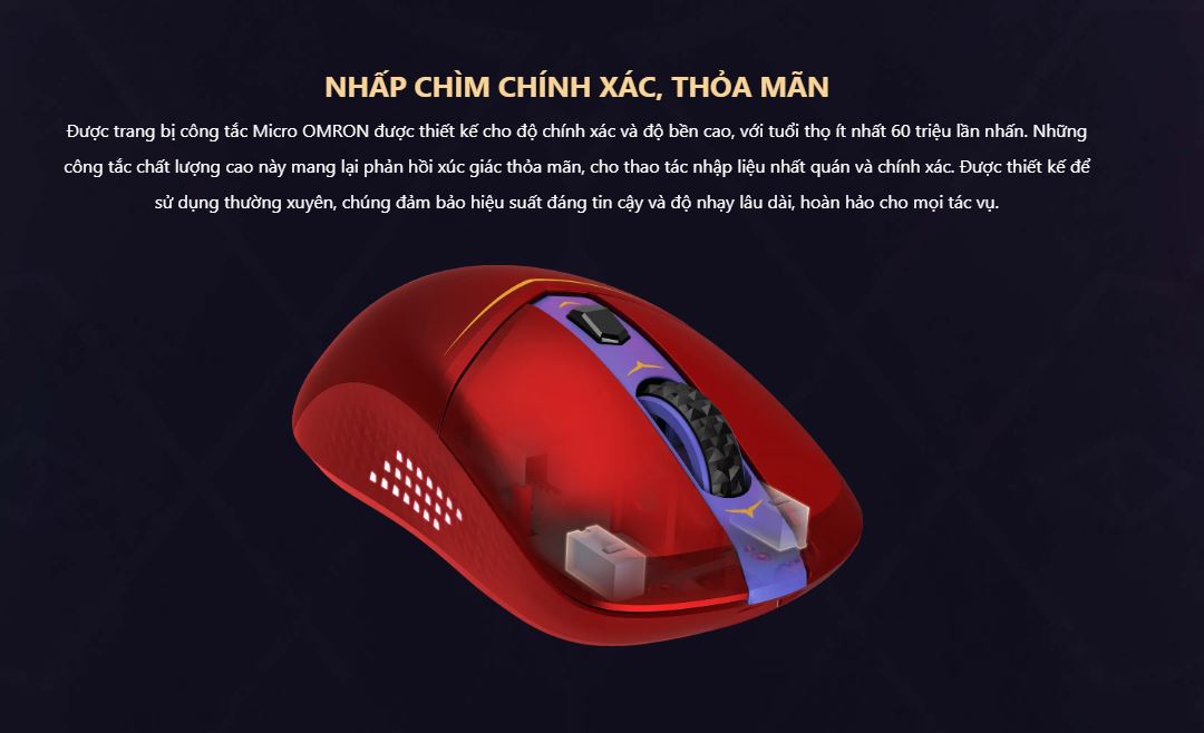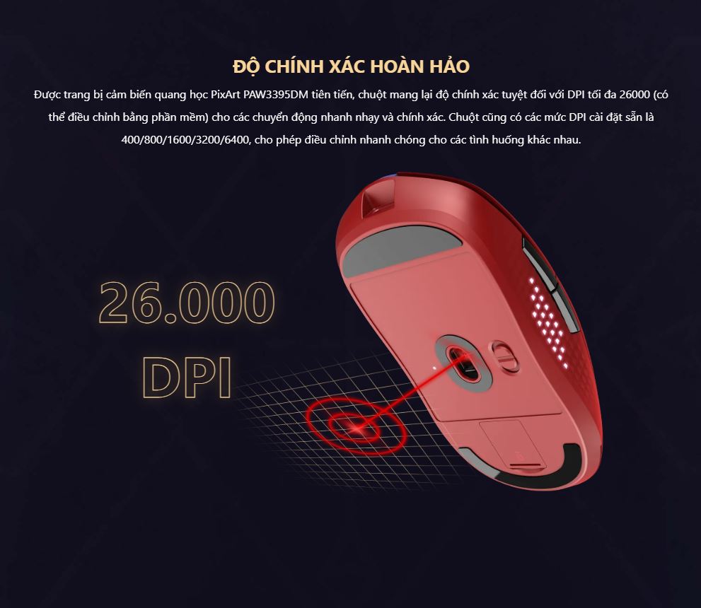 • - ĐỘ CHÍNH XÁC HOÀN HẢO - Được thiết kế để thống trị trò chơi, cảm biến quang học PixArt PAW3395DM cung cấp tới 26.000 DPI và tốc độ lấy mẫu 1000Hz, khiến nó trở thành một công cụ đáng gờm trong tay người chơi lành nghề.
