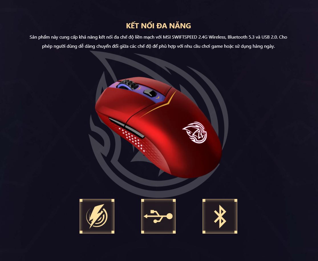 • - KẾT NỐI ĐA NĂNG - Chọn chế độ không dây, Bluetooth hoặc có dây MSI SWIFTSPEED 2.4G để có hiệu suất chơi game ổn định, độ trễ thấp