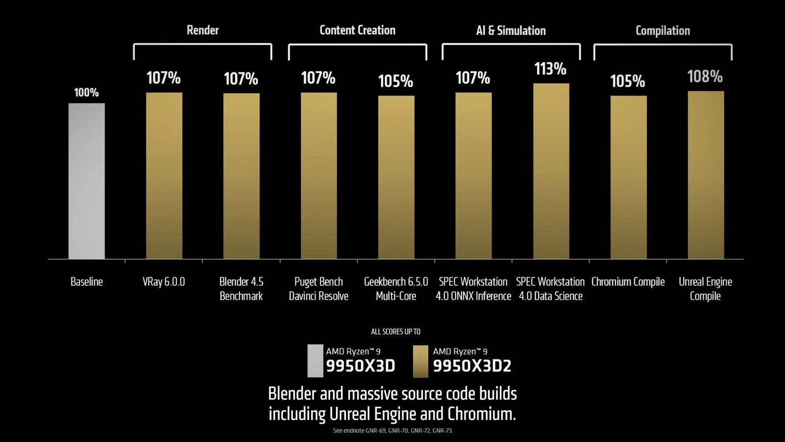 Về hiệu năng, Jack Huynh, Phó Chủ tịch cấp cao kiêm Tổng Giám đốc Nhóm Máy tính và Đồ họa của AMD, đã khẳng định rằng Ryzen 9 9950X3D2 sẽ mang lại hiệu năng tuyệt vời trong chơi game và công việc. Mặc dù AMD chưa chia sẻ bất kỳ điểm chuẩn chơi game nào , nhưng dự kiến CPU này sẽ cho hiệu năng tốt hơn tới 7% so với 9950X3D trong các bài kiểm tra render như V-Ray và Blender, và nhanh hơn khoảng 5% đến 7% trong các bài kiểm tra tạo nội dung, bao gồm Puget cho DaVinci Resolve và Geekbench đa nhân. Chip này cũng được cho là mang lại hiệu năng nhanh hơn tới 13% trong AI và mô phỏng, và nhanh hơn 8% trong quá trình biên dịch Unreal Engine.