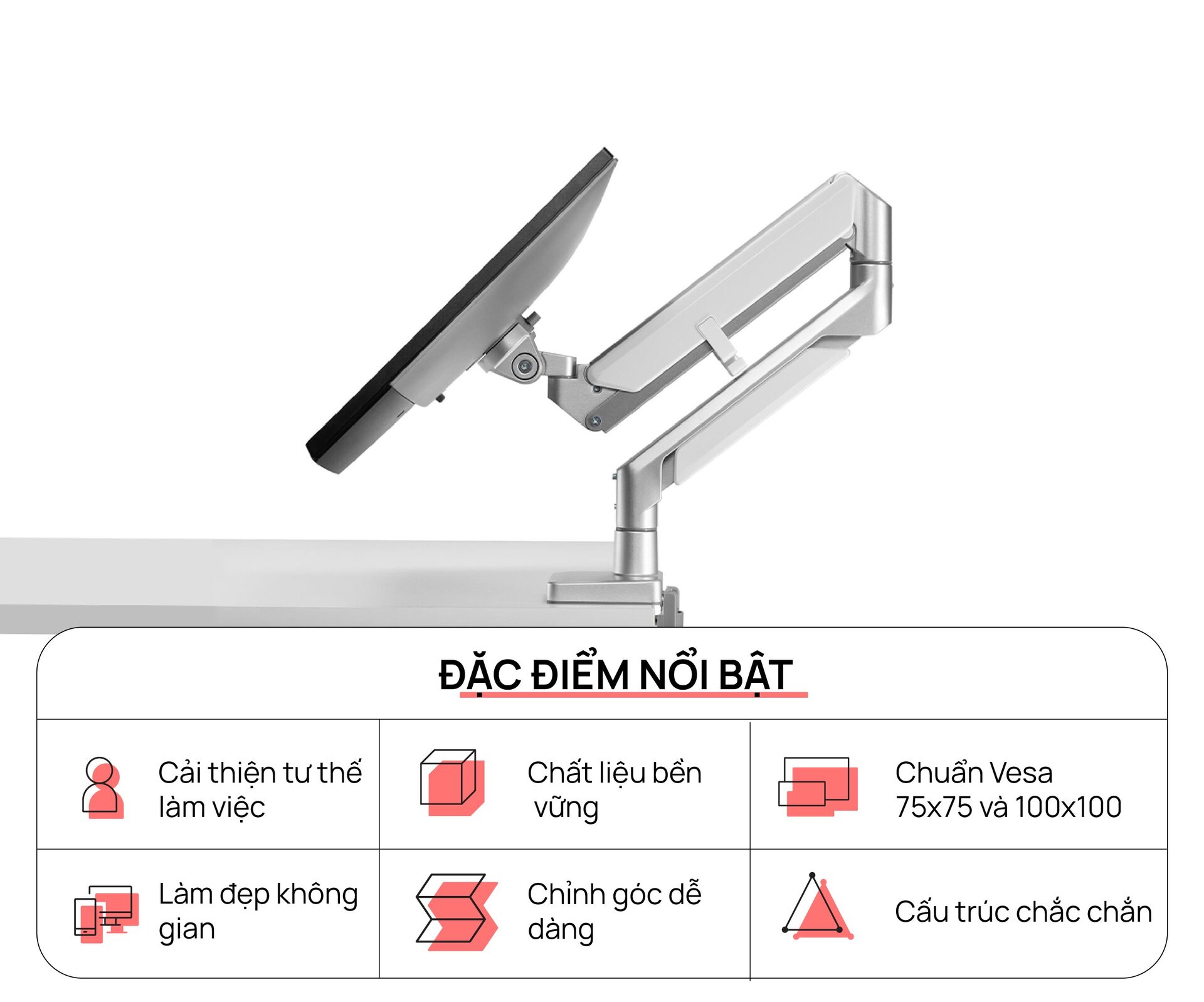 - Theo thông tin của nhà sản xuất đưa ra, Monitor Arm này có thể đỡ được các màn 17 - 32 inch và màn hình nặng khoảng 1-9kg.