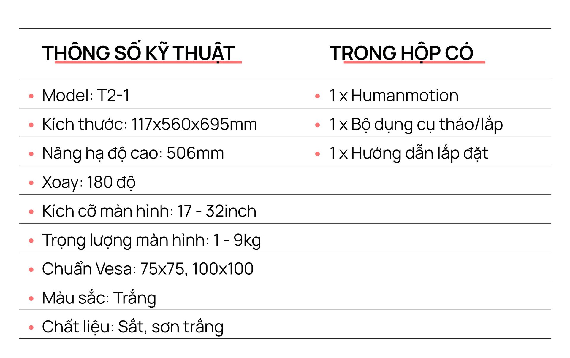 - Kết cấu sản phẩm vô cùng tinh tế, kỹ xảo hiện đại giúp giá treo màn hình Human Motion T2-1U không có khuyết điểm đối với người dùng hiện tại.