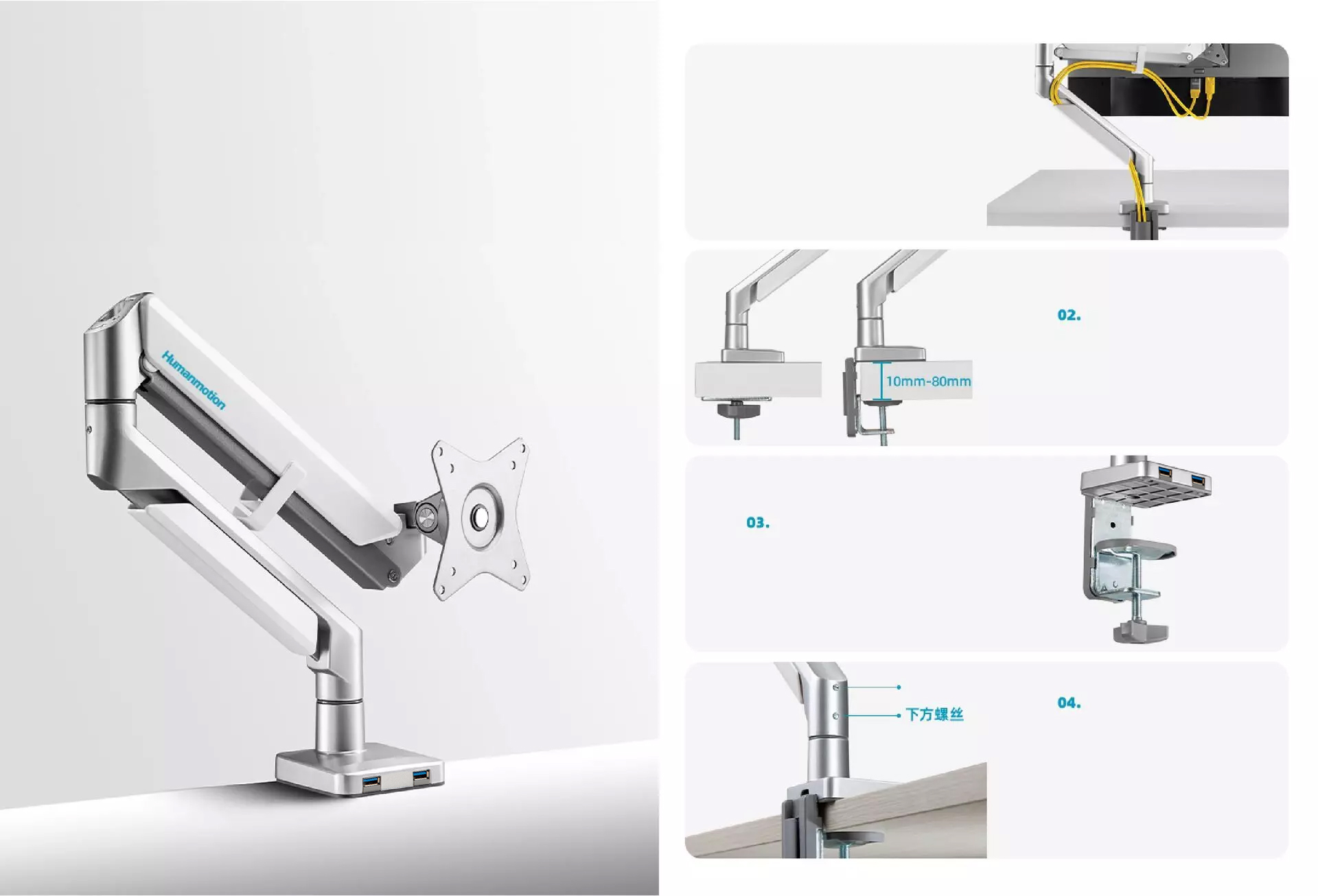 - Human Motion hỗ trợ 2 hình thức là kẹp bàn và khoan lỗ trên mặt bàn. Rất linh hoạt để khách hàng lựa chọn.