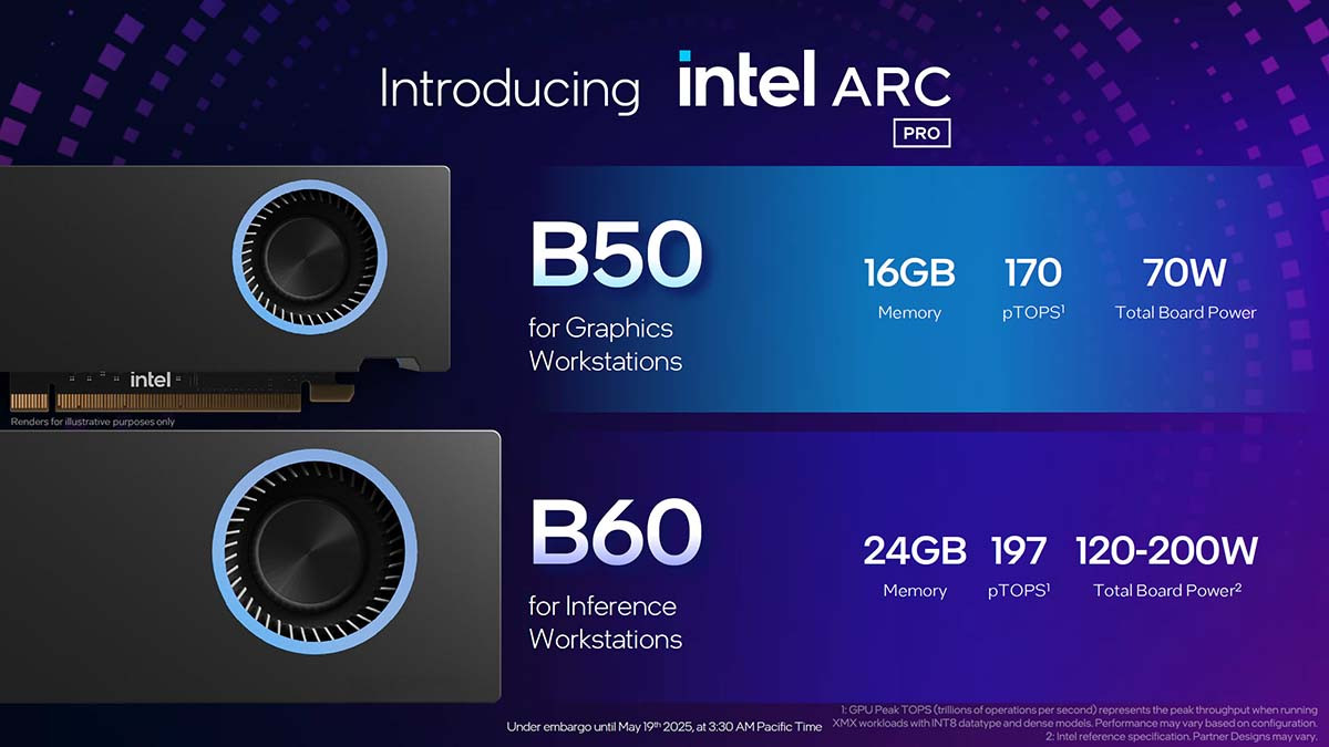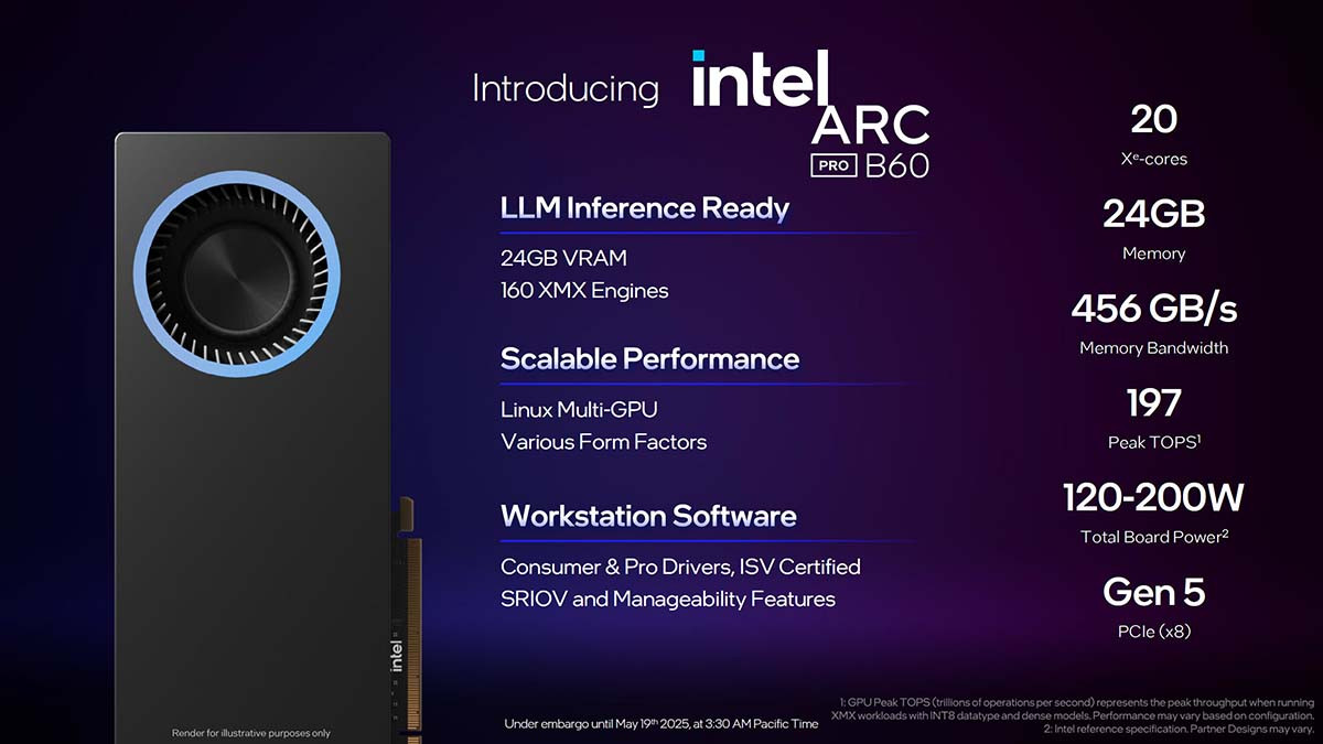 Với mục đích này, các đối tác Intel được chọn (như Maxsun) sẽ cung cấp giải pháp Intel Arc Pro B60 với GPU kép. Chúng không được kết nối thông qua chip PLX mà hoạt động như một GPU riêng biệt, mỗi GPU có 24 GB VRAM riêng, tổng cộng là 48 GB VRAM cho mỗi card.