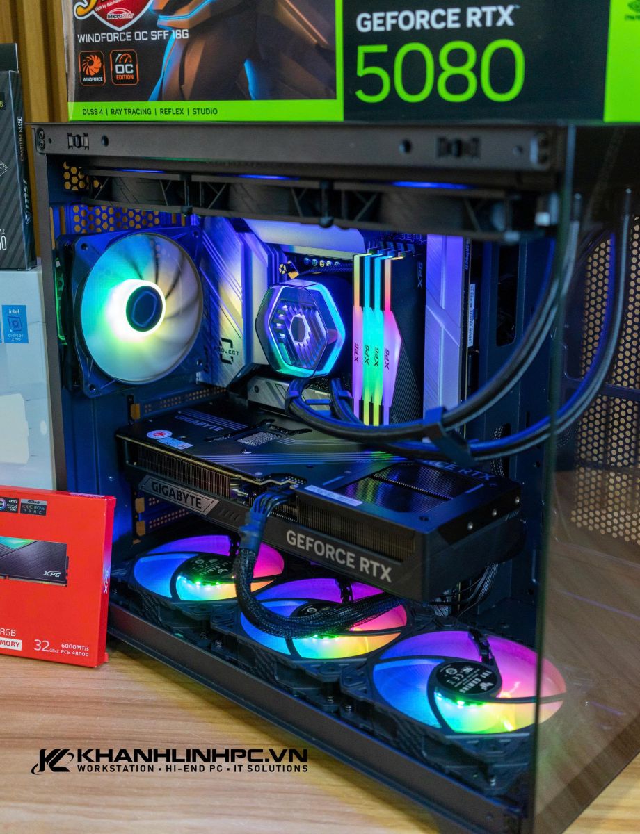 Điểm nhấn của bộ máy là Gigabyte RTX 5080 WINDFORCE OC SFF 16GB, chiếc VGA sở hữu hiệu năng đồ họa hàng đầu hiện nay. RTX 5080 cho phép chơi mượt mọi tựa game AAA ở 2K – 4K, bật tối đa Ray Tracing, đồng thời tăng tốc mạnh mẽ các tác vụ render và xử lý đồ họa chuyên nghiệp. Đây là lựa chọn lý tưởng cho game thủ hardcore, nhà thiết kế, editor, streamer và người làm việc với những dự án sáng tạo nặng.