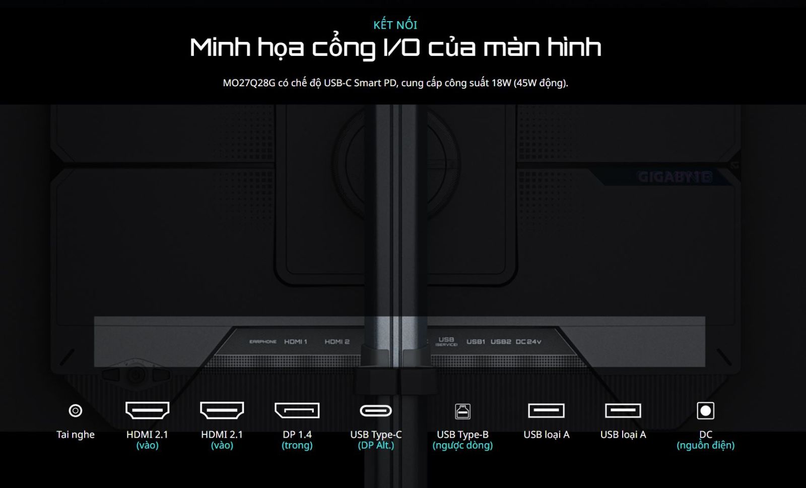• - Cổng kết nối: HDMI 2.1, Displayport 1.4, USB Type-C, USB 3.2, Earphone Jack