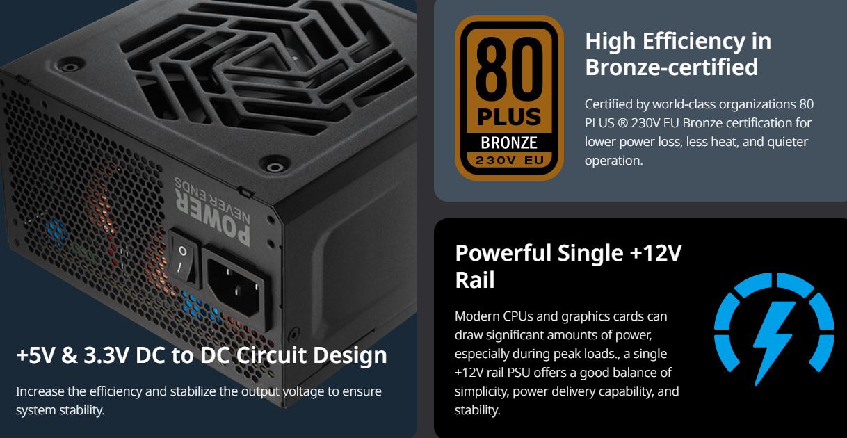 Nguồn có khả năng duy trì điện áp ≥ 12ms ở mức tải 100%, giúp hệ thống không bị tắt đột ngột khi gặp sự cố điện áp hoặc mất điện chớp nhoáng. Tích hợp Active PFC với hệ số công suất ≥ 0.9, giúp tối ưu khả năng chuyển đổi điện năng và hạn chế nhiễu điện đầu vào.