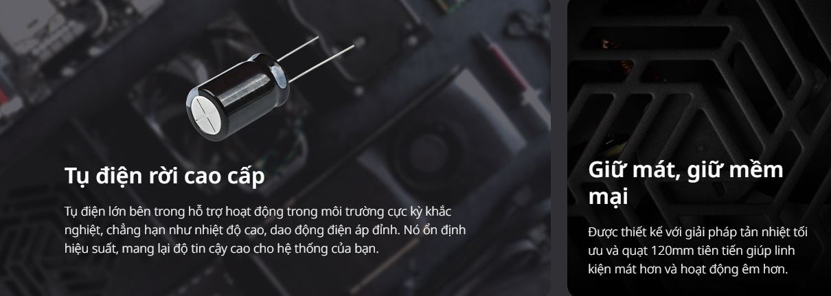 Sản phẩm được trang bị quạt tản nhiệt 120mm dạng Sleeve Bearing, hoạt động êm ái và hiệu quả trong việc làm mát bộ nguồn. Quạt hoạt động tự động theo nhiệt độ, giúp duy trì môi trường ổn định, tránh quá nhiệt và tăng độ bền linh kiện bên trong.