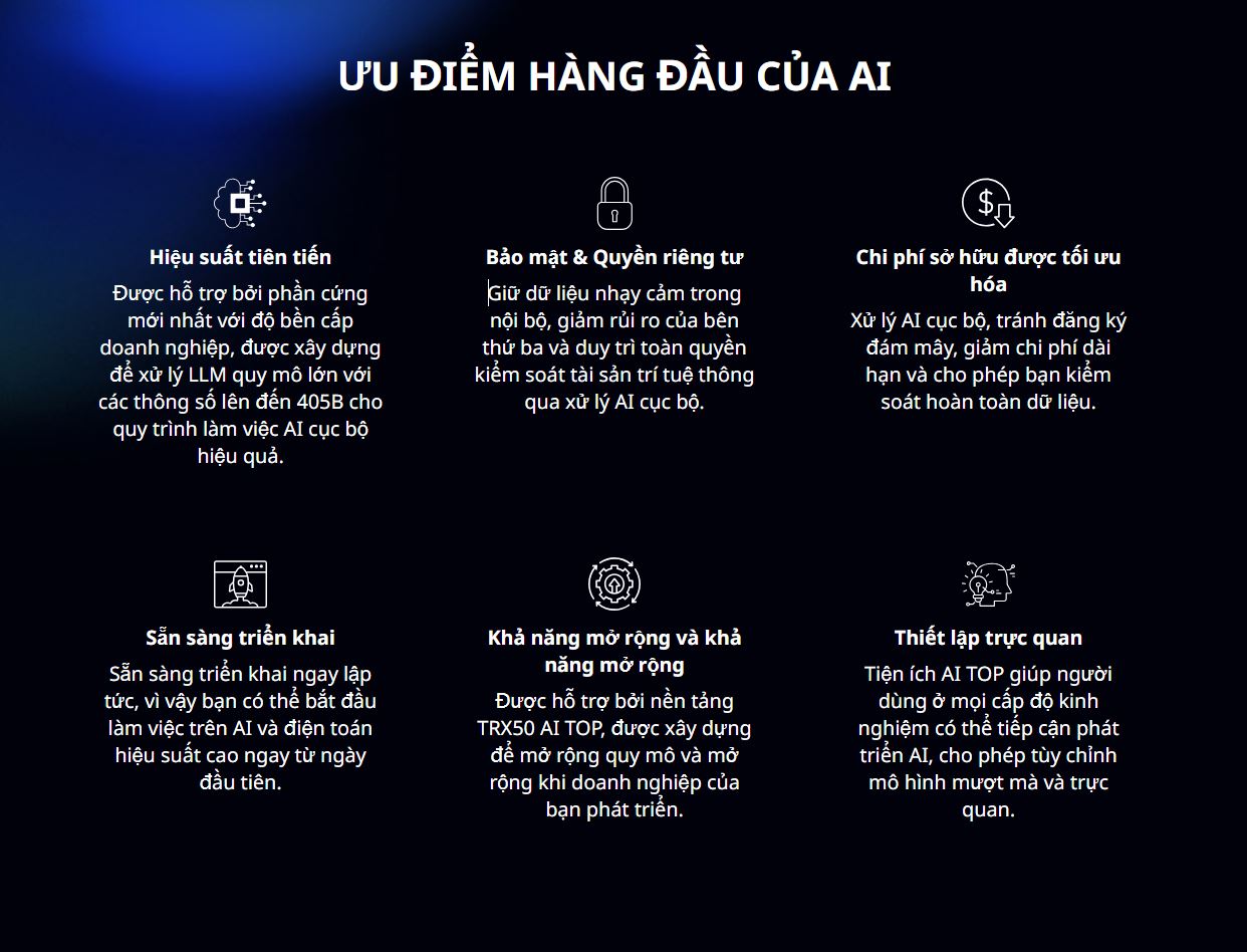 - Độ Trễ Thấp (Low Latency): Vì việc suy luận được thực hiện ngay tại chỗ (on-premise), AI TOP 500 TRX50 loại bỏ độ trễ mạng và chi phí liên quan đến việc gửi yêu cầu lên đám mây (cloud). Điều này cực kỳ quan trọng đối với các ứng dụng yêu cầu phản hồi nhanh như chatbot thời gian thực, thị giác máy tính trong dây chuyền sản xuất hoặc các hệ thống Edge AI.