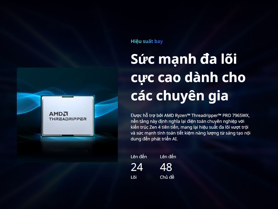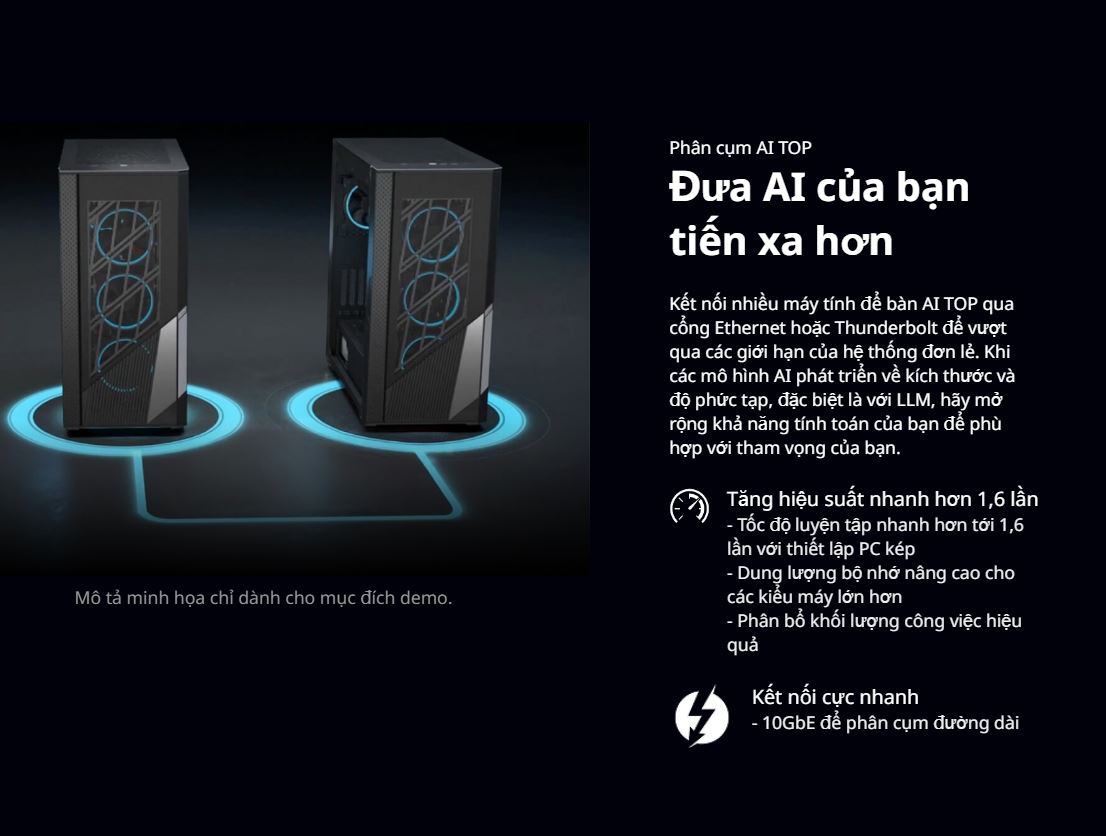 - Mở rộng Sức mạnh Linh hoạt: Kiến trúc TRX50 với 4 khe PCIe 5.0 x16 cho phép người dùng dễ dàng nâng cấp hoặc gắn thêm các card xử lý AI chuyên dụng (accelerator) hoặc GPU trong tương lai. Tính năng kết nối Dual 10GbE và Thunderbolt 5 cho phép biến máy trạm này thành một nút (node) mạnh mẽ trong cụm máy tính AI lớn hơn khi nhu cầu phát triển.