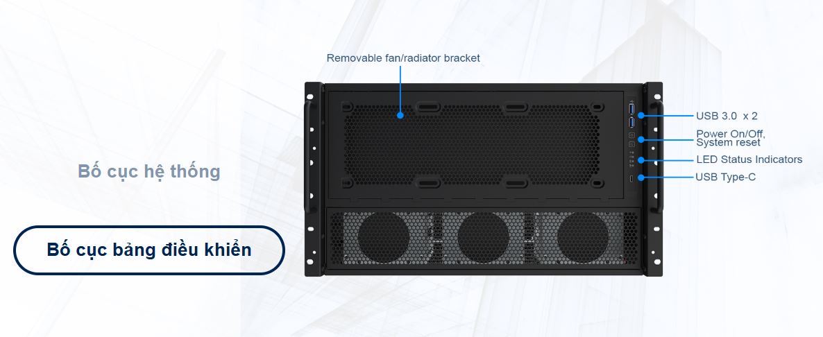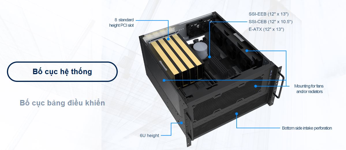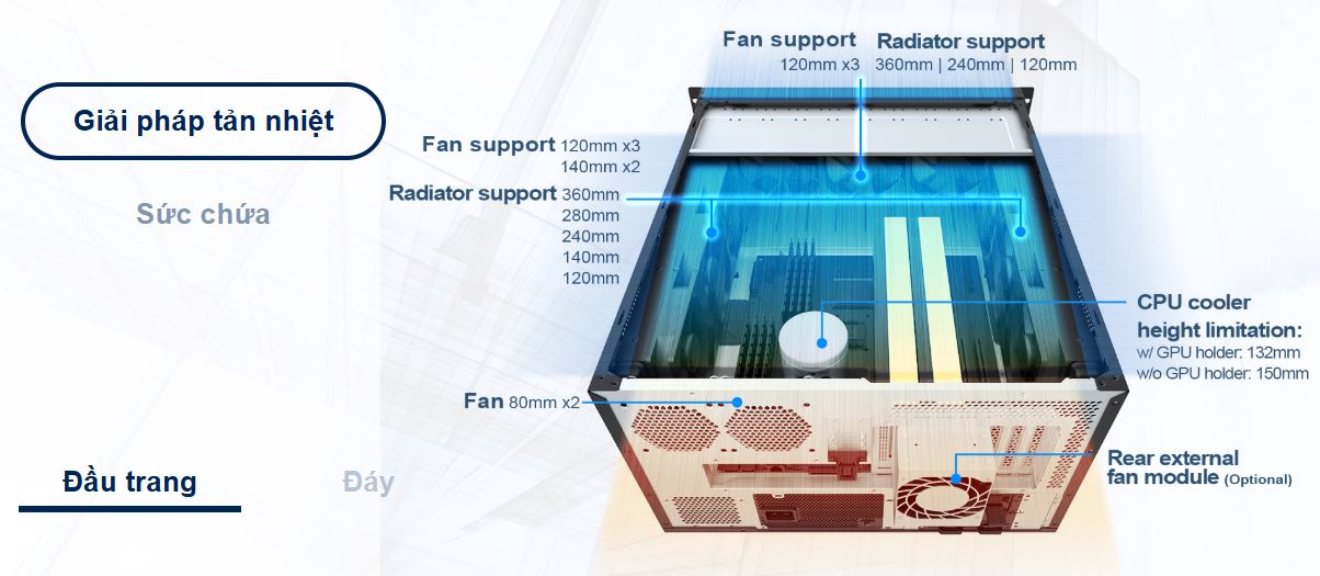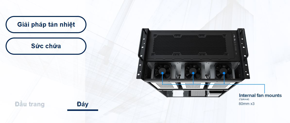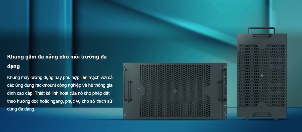 Vượt qua các tiêu chuẩn làm mát thông thường - Với ba bộ giá treo quạt 3 x 120mm được đặt ở phía trước và cả hai bên của khung máy, mỗi bộ tạo điều kiện thuận lợi cho việc lắp đặt một bộ tản nhiệt 360mm duy nhất, có thể chứa tổng cộng ba bộ tản nhiệt 360mm. Thiết kế này không chỉ thiết lập một thị trường ngách độc đáo mà còn vượt qua các tiêu chuẩn làm mát rackmount truyền thống.