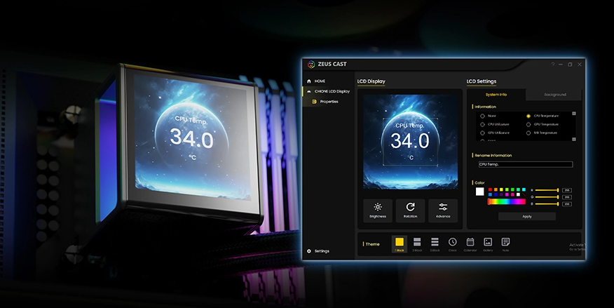 ZEUS CAST không chỉ giúp tải lên ảnh động mà còn cung cấp thư viện giao diện động để hiển thị thông tin hệ thống. Hỗ trợ xoay màn hình, điều chỉnh độ sáng dễ dàng và đồng bộ ánh sáng ARGB với hệ thống.