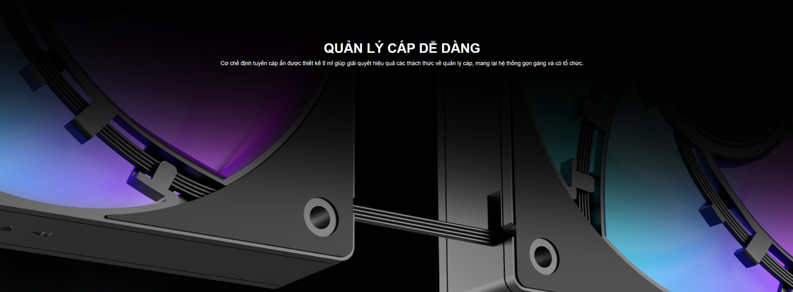 Hệ thống ba quạt 120mm giúp tối ưu lưu lượng khí lên đến 81.81 CFM với áp suất tĩnh mạnh mẽ, đảm bảo làm mát nhanh chóng. Vòng bi thủy lực giảm tiếng ồn, tăng tuổi thọ quạt. Tích hợp RGB đồng bộ màu sắc với hệ thống. Điều chỉnh tốc độ quạt qua PWM, tối ưu làm mát và độ yên tĩnh.