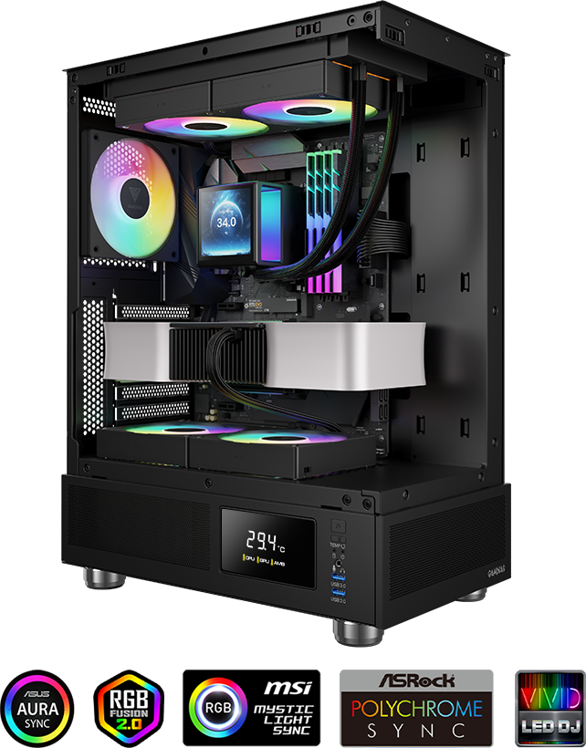 Điểm nổi bật của CHIONE P5-240 là màn hình IPS LCD 3.4 inch, cho phép bạn theo dõi nhiệt độ CPU, GPU, tốc độ quạt theo thời gian thực. Người dùng có thể tùy chỉnh hình ảnh, GIF động để cá nhân hóa hệ thống. Phần mềm ZEUS CAST hỗ trợ điều chỉnh độ sáng và góc hiển thị dễ dàng.