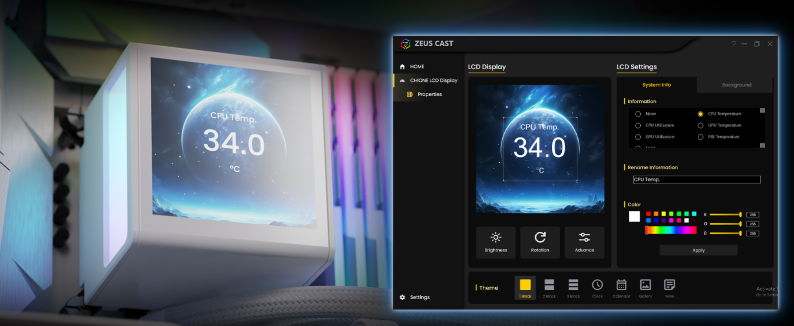ZEUS CAST không chỉ giúp tải lên ảnh động mà còn cung cấp thư viện giao diện động để hiển thị thông tin hệ thống. Hỗ trợ xoay màn hình, điều chỉnh độ sáng dễ dàng và đồng bộ ánh sáng ARGB với hệ thống.