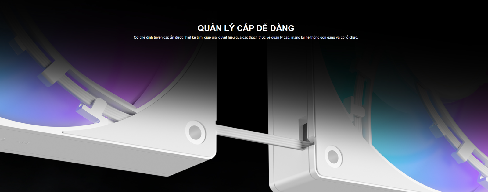 Hệ thống ba quạt 120mm giúp tối ưu lưu lượng khí lên đến 81.81 CFM với áp suất tĩnh mạnh mẽ, đảm bảo làm mát nhanh chóng. Vòng bi thủy lực giảm tiếng ồn, tăng tuổi thọ quạt. Tích hợp RGB đồng bộ màu sắc với hệ thống. Điều chỉnh tốc độ quạt qua PWM, tối ưu làm mát và độ yên tĩnh.