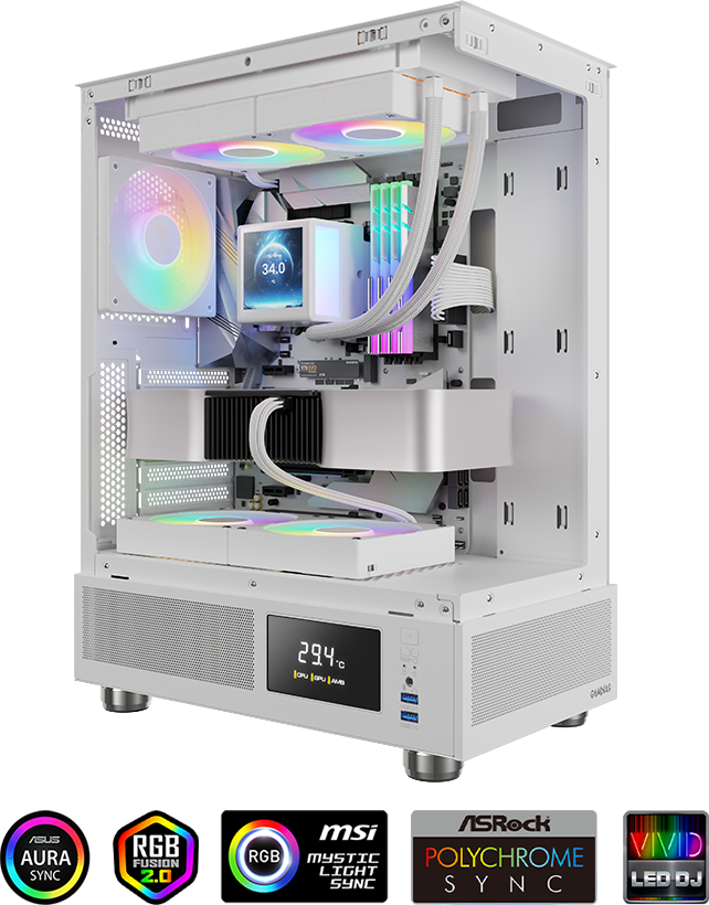 Điểm nổi bật của CHIONE P5-240 là màn hình IPS LCD 3.4 inch, cho phép bạn theo dõi nhiệt độ CPU, GPU, tốc độ quạt theo thời gian thực. Người dùng có thể tùy chỉnh hình ảnh, GIF động để cá nhân hóa hệ thống. Phần mềm ZEUS CAST hỗ trợ điều chỉnh độ sáng và góc hiển thị dễ dàng.
