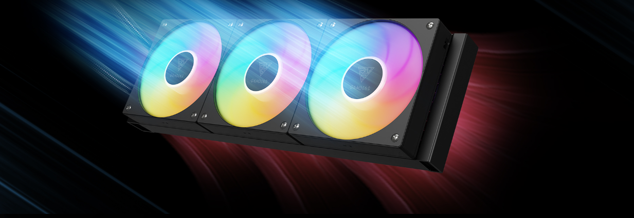 Hệ thống ba quạt 120mm giúp tối ưu lưu lượng khí lên đến 81.81 CFM với áp suất tĩnh mạnh mẽ, đảm bảo làm mát nhanh chóng. Vòng bi thủy lực giảm tiếng ồn, tăng tuổi thọ quạt. Tích hợp RGB đồng bộ màu sắc với hệ thống. Điều chỉnh tốc độ quạt qua PWM, tối ưu làm mát và độ yên tĩnh.