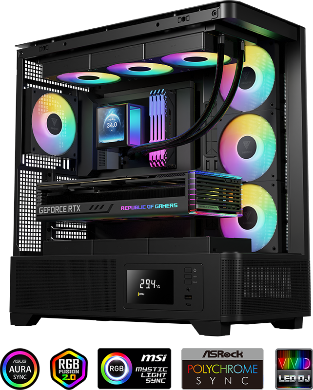 CHIONE P5-360 cho phép tùy chỉnh 30 hiệu ứng ánh sáng, dễ dàng điều khiển qua nút chuyển đổi hoặc nút LED case. Hỗ trợ đồng bộ ARGB với mainboard có header 5V 3-Pin để tạo hiệu ứng ánh sáng hoàn mỹ.